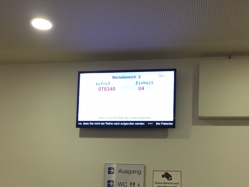 Das Titelbild zeigt einen großen Bildschirm an einer Wand, auf dem die Wartenummer und der Behandlungsraum angezeigt werden.